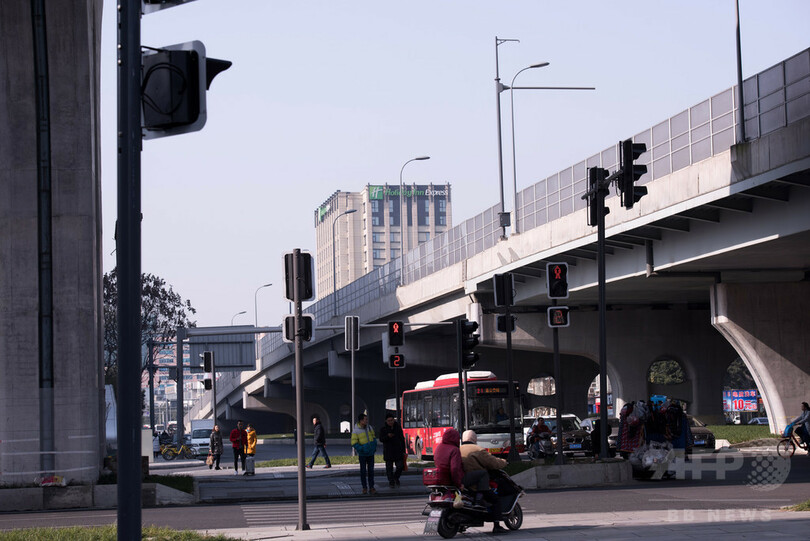 交差点の上のジャンクションが、信号が多い原因の一つのようだ。駅前の交差点でもあり、歩行者にとっては見渡す限り信号がある。成都で最も信号が多い交差点と呼ばれている。(c)CNS/JCM/AFPBB News