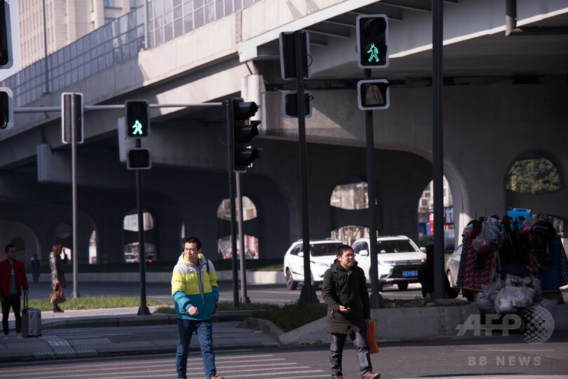 交差点の上のジャンクションが、信号が多い原因の一つのようだ。駅前の交差点でもあり、歩行者にとっては見渡す限り信号がある。成都で最も信号が多い交差点と呼ばれている。(c)CNS/JCM/AFPBB News