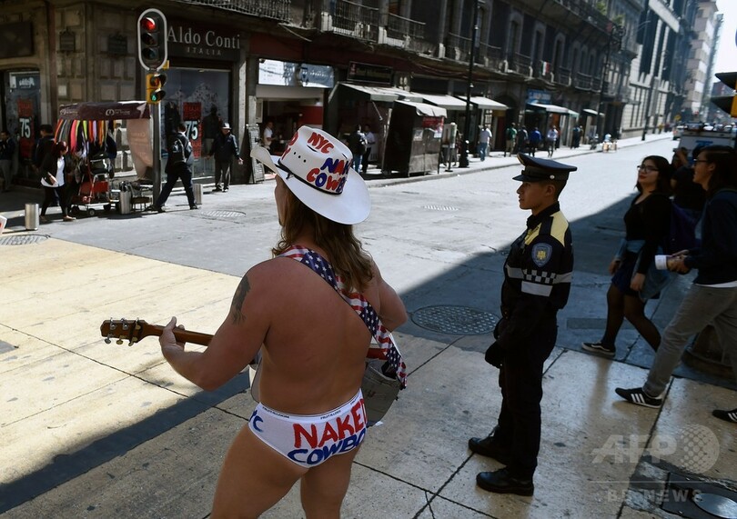 NY名物「裸のカウボーイ」、メキシコに出没 トランプ氏への愛歌う