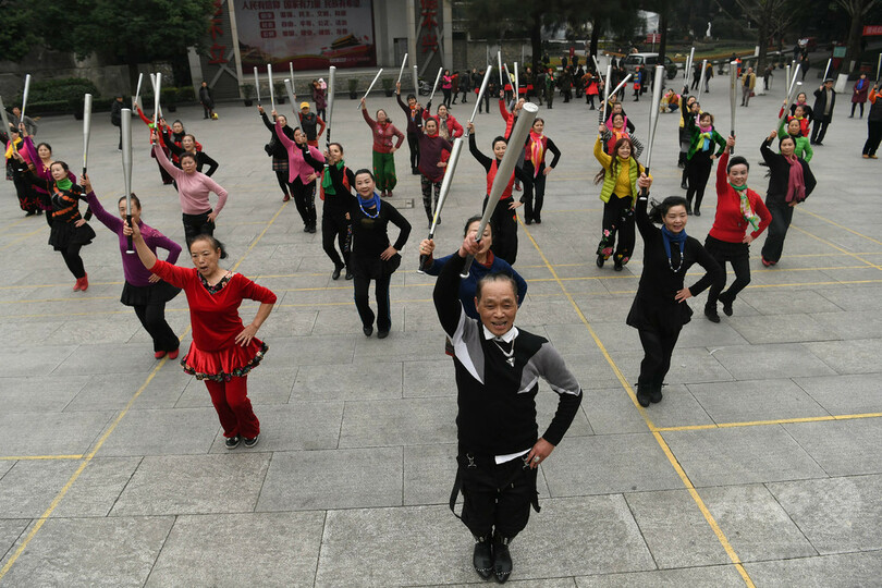 野球バットで広場ダンス 中国・重慶の高齢者グループ