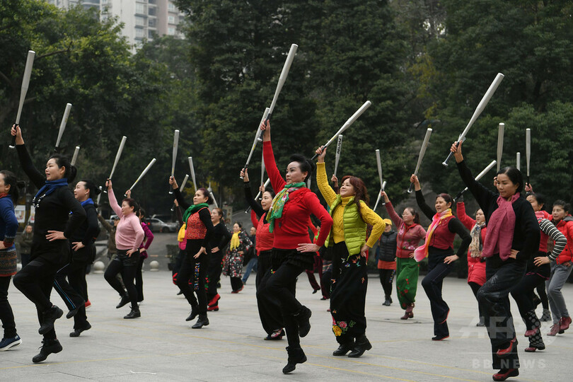 野球バットで広場ダンス 中国・重慶の高齢者グループ