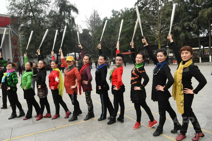 野球バットで広場ダンス 中国・重慶の高齢者グループ