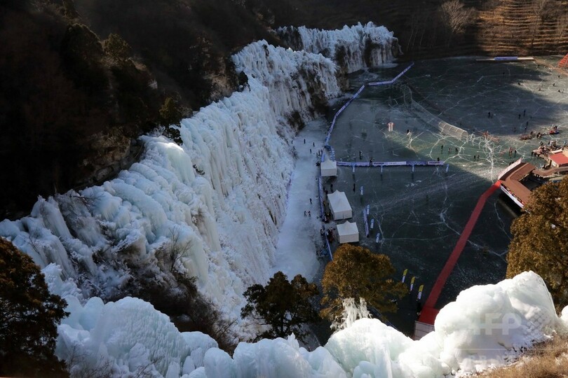 全国から65人の愛好家が集結。普段はさまざまな職業に就いている人たちが、高さ32メートル、幅2.5メートルの氷壁をよじ登り、その速さを競い合った。男女別の予選と決勝戦が行われ、男子1位は成都市(Chengdu)から参加した陳さんで52.9秒、女子1位は北京市の梁さんで131.35秒だった。(c)CNS/JCM/AFPBB News