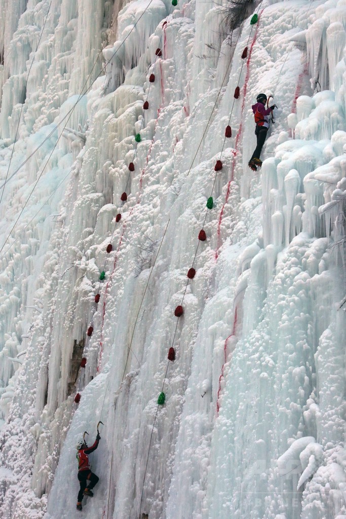 全国から65人の愛好家が集結。普段はさまざまな職業に就いている人たちが、高さ32メートル、幅2.5メートルの氷壁をよじ登り、その速さを競い合った。男女別の予選と決勝戦が行われ、男子1位は成都市(Chengdu)から参加した陳さんで52.9秒、女子1位は北京市の梁さんで131.35秒だった。(c)CNS/JCM/AFPBB News