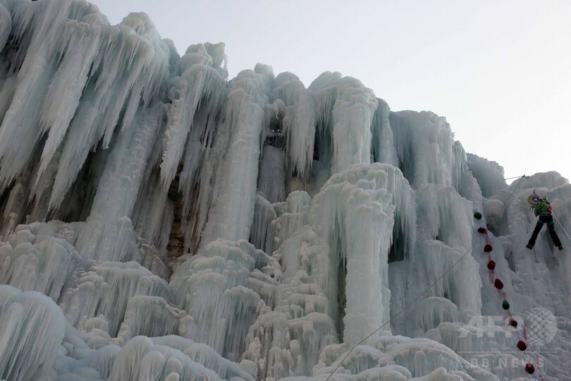 全国から65人の愛好家が集結。普段はさまざまな職業に就いている人たちが、高さ32メートル、幅2.5メートルの氷壁をよじ登り、その速さを競い合った。男女別の予選と決勝戦が行われ、男子1位は成都市(Chengdu)から参加した陳さんで52.9秒、女子1位は北京市の梁さんで131.35秒だった。(c)CNS/JCM/AFPBB News