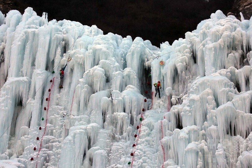 32メートルの氷壁に挑む 北京でアイスクライミング選手権