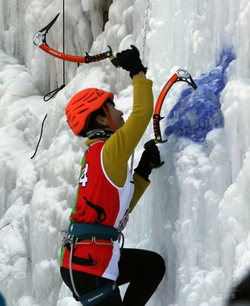 全国から65人の愛好家が集結。普段はさまざまな職業に就いている人たちが、高さ32メートル、幅2.5メートルの氷壁をよじ登り、その速さを競い合った。男女別の予選と決勝戦が行われ、男子1位は成都市(Chengdu)から参加した陳さんで52.9秒、女子1位は北京市の梁さんで131.35秒だった。(c)CNS/JCM/AFPBB News