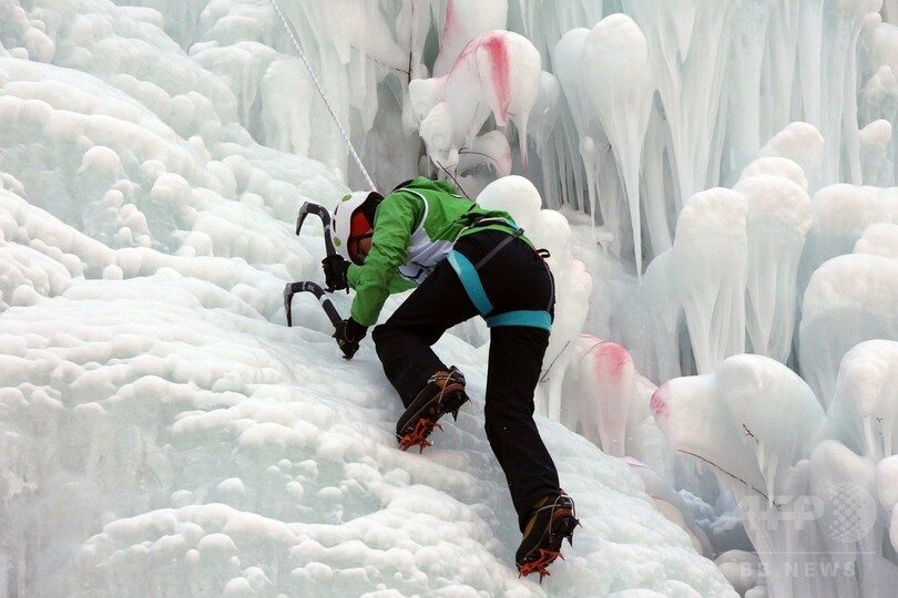 全国から65人の愛好家が集結。普段はさまざまな職業に就いている人たちが、高さ32メートル、幅2.5メートルの氷壁をよじ登り、その速さを競い合った。男女別の予選と決勝戦が行われ、男子1位は成都市(Chengdu)から参加した陳さんで52.9秒、女子1位は北京市の梁さんで131.35秒だった。(c)CNS/JCM/AFPBB News
