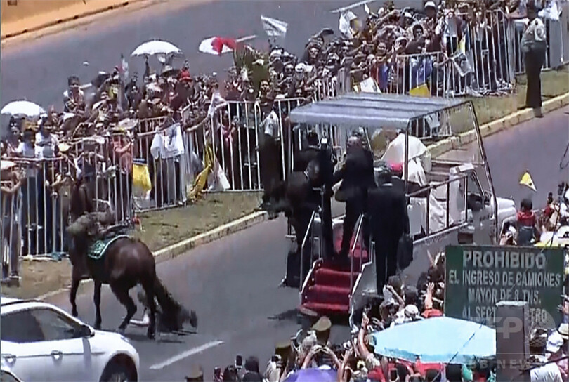 【1月19日 AFP】チリ北部イキケ(Iquique)で18日、同国を訪問中のローマ・カトリック教会のフランシスコ(Francis)法王が乗った専用車「パパモビル(Popemobile)」に送られた声援に馬が驚き、乗っていた女性警官が落馬する事件が起きた。フランシスコ法王はパパモビルを降り、女性警官のそばに歩み寄って容態を見守った。