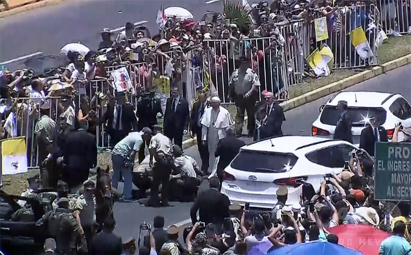 声援に馬びっくり、落馬した女性警官にローマ法王歩み寄る
