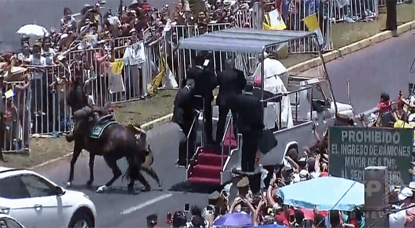 【1月19日 AFP】チリ北部イキケ(Iquique)で18日、同国を訪問中のローマ・カトリック教会のフランシスコ(Francis)法王が乗った専用車「パパモビル(Popemobile)」に送られた声援に馬が驚き、乗っていた女性警官が落馬する事件が起きた。フランシスコ法王はパパモビルを降り、女性警官のそばに歩み寄って容態を見守った。