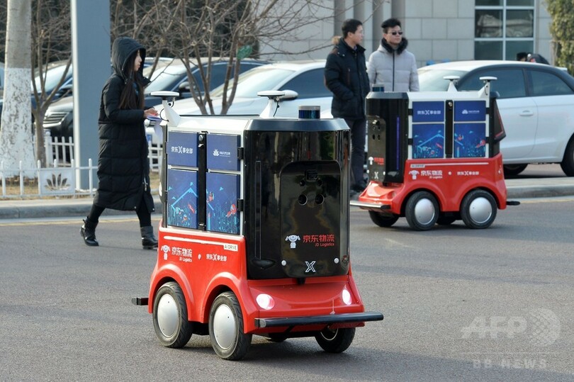 【1月23日 AFP】中国東部の港湾都市、天津(Tianjin)にある中国・シンガポール天津エコシティ(Sino-Singapore Tianjin Eco-City)で先週、中国のネット通販大手、京東集団(JD.com)の無人配達用自動車の試験運転が実施された。