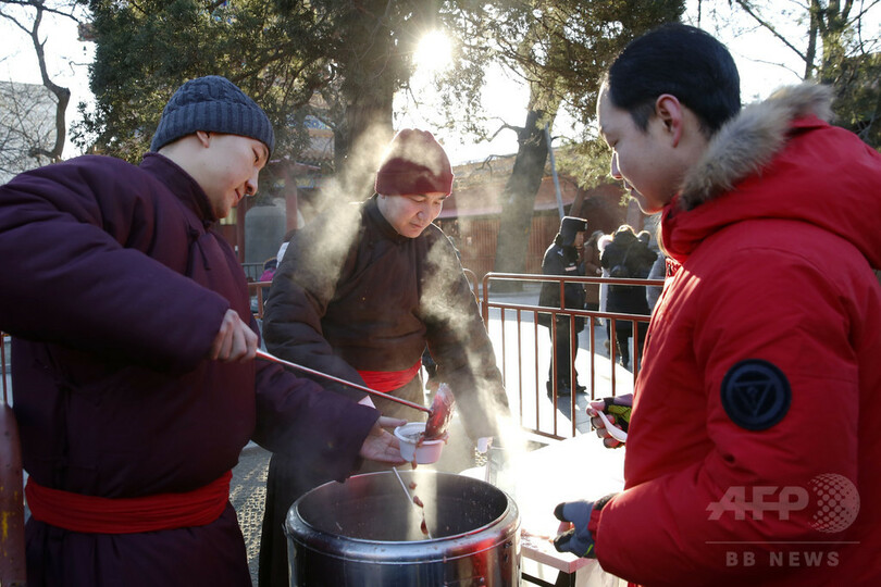 この日は、「臘八粥」と呼ばれる地域の特産物を使った五目かゆを家庭で作る。各地の寺では臘八節を祝う催しが行なわれ、訪れた市民にかゆが振る舞われた。寺の境内で市民がかゆを食べるのも、古くから「臘八節」おなじみの光景だ。(c)CNS/JCM/AFPBB News