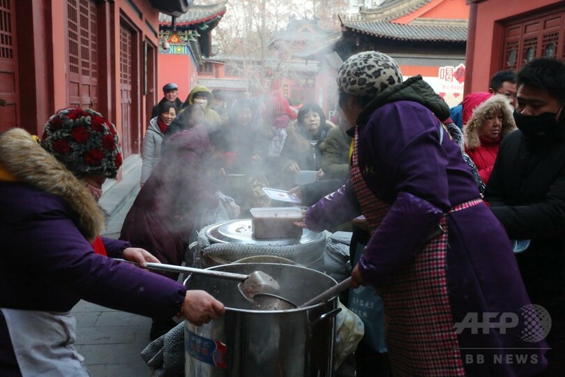 この日は、「臘八粥」と呼ばれる地域の特産物を使った五目かゆを家庭で作る。各地の寺では臘八節を祝う催しが行なわれ、訪れた市民にかゆが振る舞われた。寺の境内で市民がかゆを食べるのも、古くから「臘八節」おなじみの光景だ。(c)CNS/JCM/AFPBB News