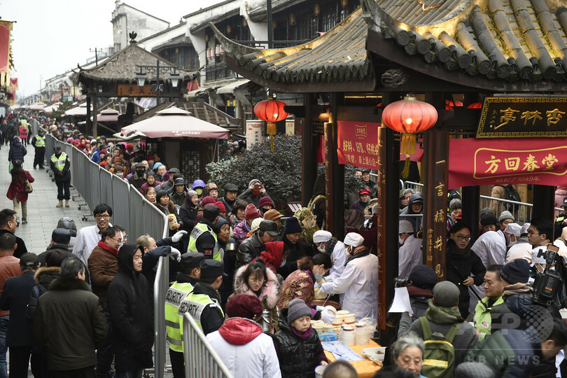 この日は、「臘八粥」と呼ばれる地域の特産物を使った五目かゆを家庭で作る。各地の寺では臘八節を祝う催しが行なわれ、訪れた市民にかゆが振る舞われた。寺の境内で市民がかゆを食べるのも、古くから「臘八節」おなじみの光景だ。(c)CNS/JCM/AFPBB News