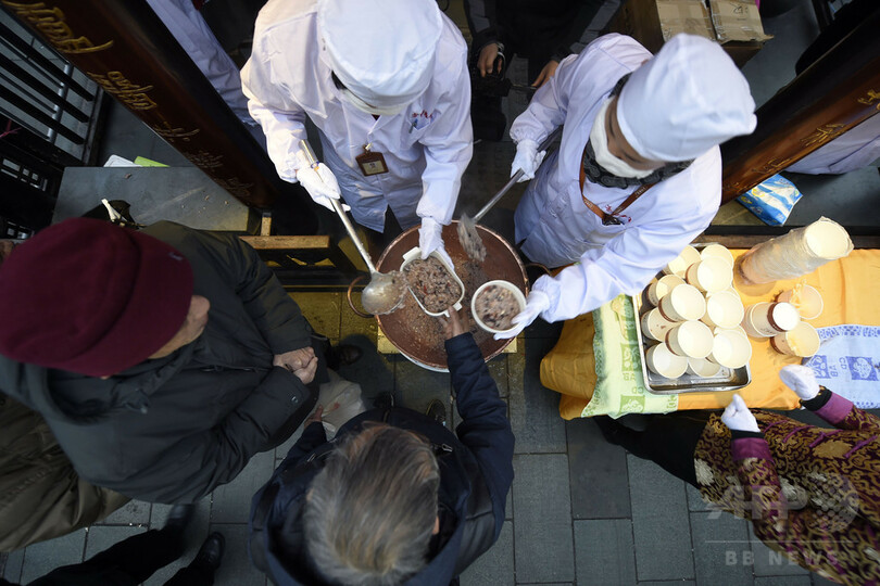 この日は、「臘八粥」と呼ばれる地域の特産物を使った五目かゆを家庭で作る。各地の寺では臘八節を祝う催しが行なわれ、訪れた市民にかゆが振る舞われた。寺の境内で市民がかゆを食べるのも、古くから「臘八節」おなじみの光景だ。(c)CNS/JCM/AFPBB News