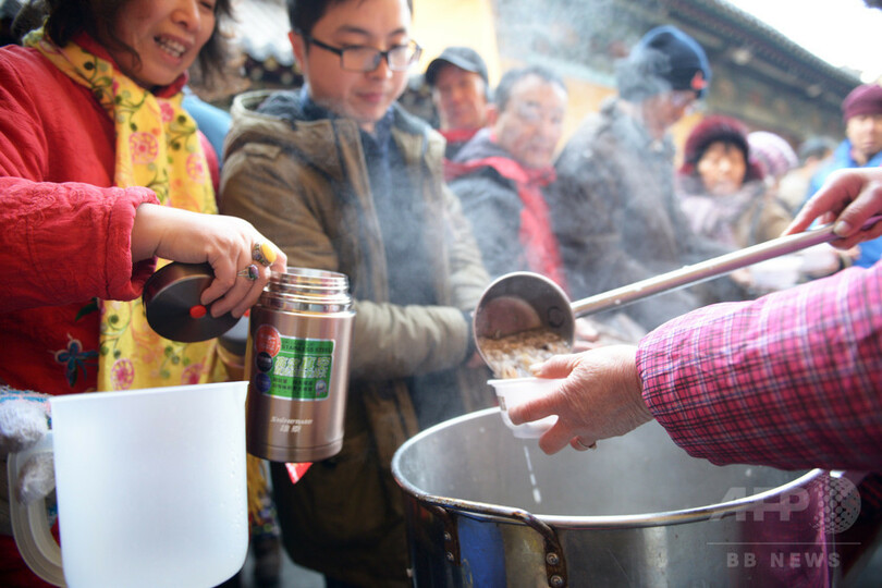 この日は、「臘八粥」と呼ばれる地域の特産物を使った五目かゆを家庭で作る。各地の寺では臘八節を祝う催しが行なわれ、訪れた市民にかゆが振る舞われた。寺の境内で市民がかゆを食べるのも、古くから「臘八節」おなじみの光景だ。(c)CNS/JCM/AFPBB News