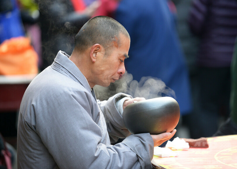この日は、「臘八粥」と呼ばれる地域の特産物を使った五目かゆを家庭で作る。各地の寺では臘八節を祝う催しが行なわれ、訪れた市民にかゆが振る舞われた。寺の境内で市民がかゆを食べるのも、古くから「臘八節」おなじみの光景だ。(c)CNS/JCM/AFPBB News