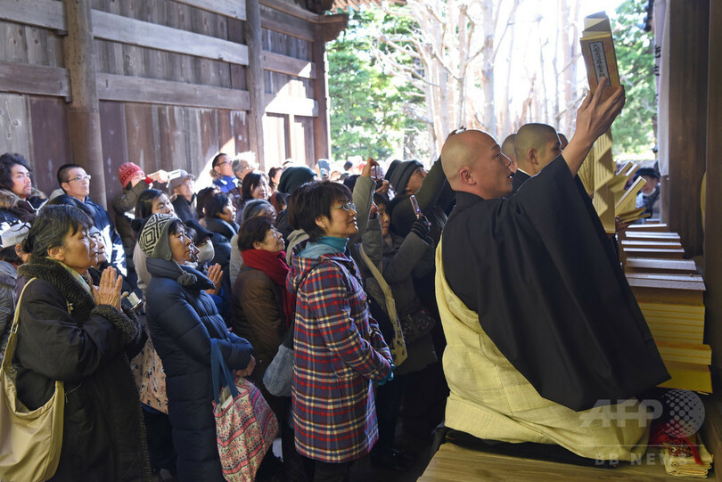 市内の大学生、日向威人(Takehito Hinata)さん(18)は、「地元なので何回も来たことはあるが、無事に大学に合格できたので今年はお礼参りに」と、祖母とともにお札を受け取った。秘仏の木造文殊菩薩像も、この日限り開帳された。(c)AFPBB News