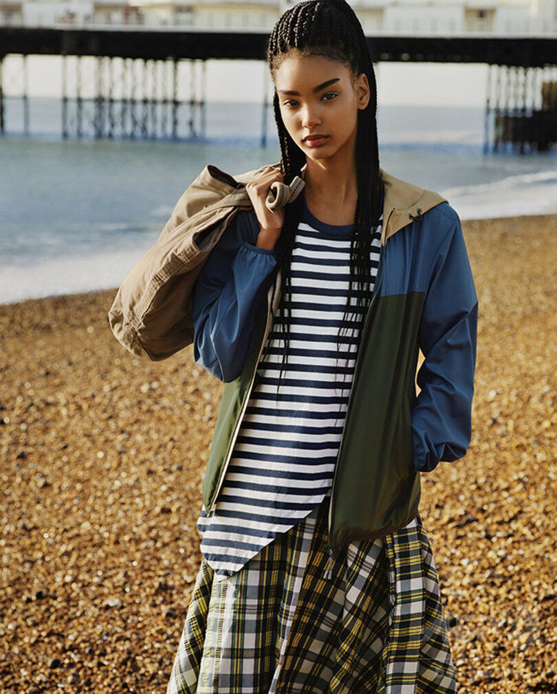 注目は、海辺を連想させるビビッドなボーダーのTシャツやワンピース、カラフルなニットポロ。シアサッカー地のボンバージャケットや「J.W.アンダーソン」に欠かせないラッフルやリボンをあしらったブラウス、フレアスカートも展開する。イギリス諸島のアイコンであるカモメのプリントを施したTシャツやニット、バッグがユーモアを添え、ブライトンの爽やかな潮風が感じられるような品揃えとなる。50年代風のデニムジャケットやトラディショナルな英国の警官服のシャツからインスパイアされたチュニックシャツといったワークウエアの要素も加わり、ブランドのDNAとも言える、ストライプやパッチワークのシャツやスカートなどディテールにもこだわっている。