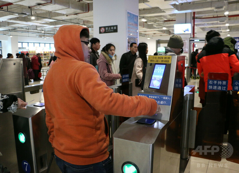 【1月31日 CNS】中国・広西(Guangxi)柳州市(Liuzhou)の柳州駅。市民らは列車に乗るため、身分証が一体化した乗車券を顔認証システムに通して駅に入っていく。駅職員は、「乗車券、身分証、人」の3つを一元的に確認する顔認証システムによって、より安全になり、自動化によってスムーズになったという。