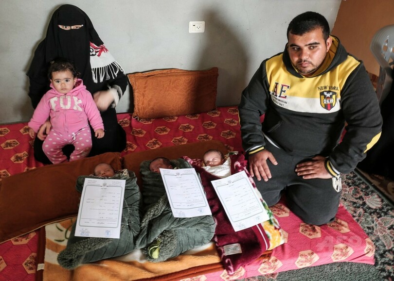 夫婦はガザ南部のハンユニス(Khan Yunis)に住むニダル・サイクリ(Nidal al-Saiqli)さん(30)とイスラム(Islam al-Saiqli)さん(25)。トランプ氏が昨年12月6日にこの決定を表明した2週間後、三つ子が誕生した。