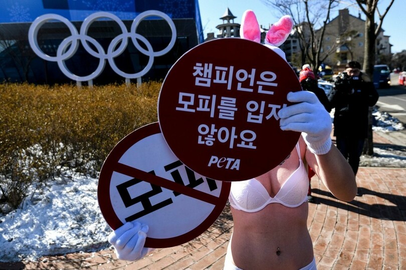 気温が氷点下16度を記録した平昌の五輪メディアセンター前では白いブラとショーツのみを身に着けたPETAのアシュリー・フルーノ(Ashley Fruno)さんが「チャンピオンは毛皮を着ない」と書かれたプラカードを掲げ15分以上も寒空に素肌をさらし続けた。