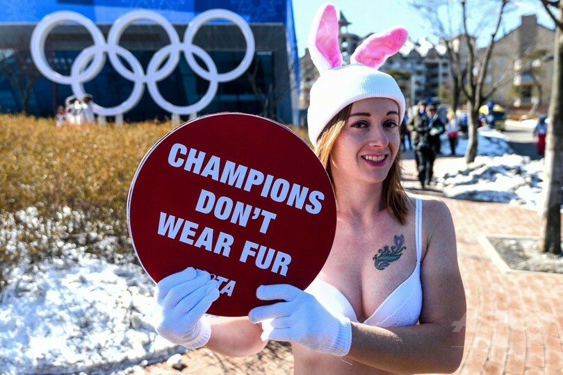 気温が氷点下16度を記録した平昌の五輪メディアセンター前では白いブラとショーツのみを身に着けたPETAのアシュリー・フルーノ(Ashley Fruno)さんが「チャンピオンは毛皮を着ない」と書かれたプラカードを掲げ15分以上も寒空に素肌をさらし続けた。