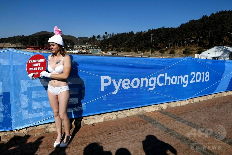 気温が氷点下16度を記録した平昌の五輪メディアセンター前では白いブラとショーツのみを身に着けたPETAのアシュリー・フルーノ(Ashley Fruno)さんが「チャンピオンは毛皮を着ない」と書かれたプラカードを掲げ15分以上も寒空に素肌をさらし続けた。