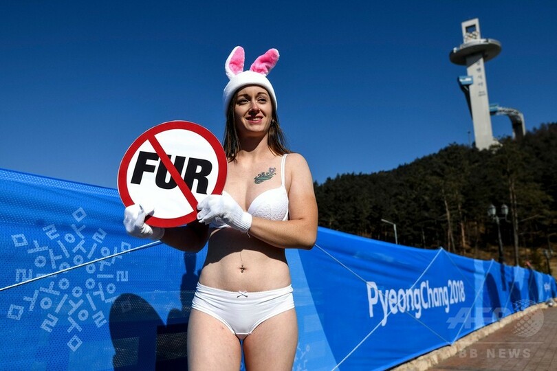 気温が氷点下16度を記録した平昌の五輪メディアセンター前では白いブラとショーツのみを身に着けたPETAのアシュリー・フルーノ(Ashley Fruno)さんが「チャンピオンは毛皮を着ない」と書かれたプラカードを掲げ15分以上も寒空に素肌をさらし続けた。