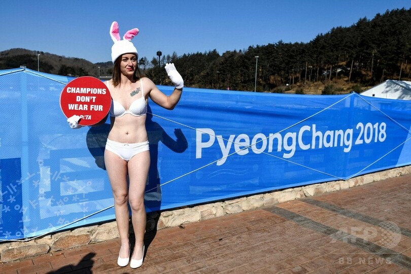 氷点下16度の平昌、下着姿の「バニーガール」が毛皮着用に抗議