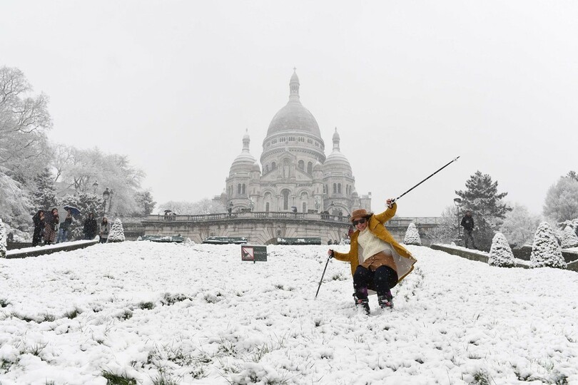 【2月8日 AFP】大雪に見舞われたフランスの首都パリでは7日、何千人もの旅行者や通勤者が交通機関の混乱に巻き込まれた。一方、市内のモンマルトル(Montmartre)地区では雪が積もった坂道をスキーで軽快に滑り降りる人の姿もみられた。