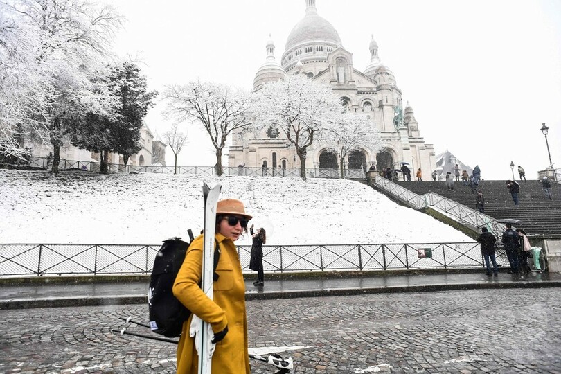 【2月8日 AFP】大雪に見舞われたフランスの首都パリでは7日、何千人もの旅行者や通勤者が交通機関の混乱に巻き込まれた。一方、市内のモンマルトル(Montmartre)地区では雪が積もった坂道をスキーで軽快に滑り降りる人の姿もみられた。