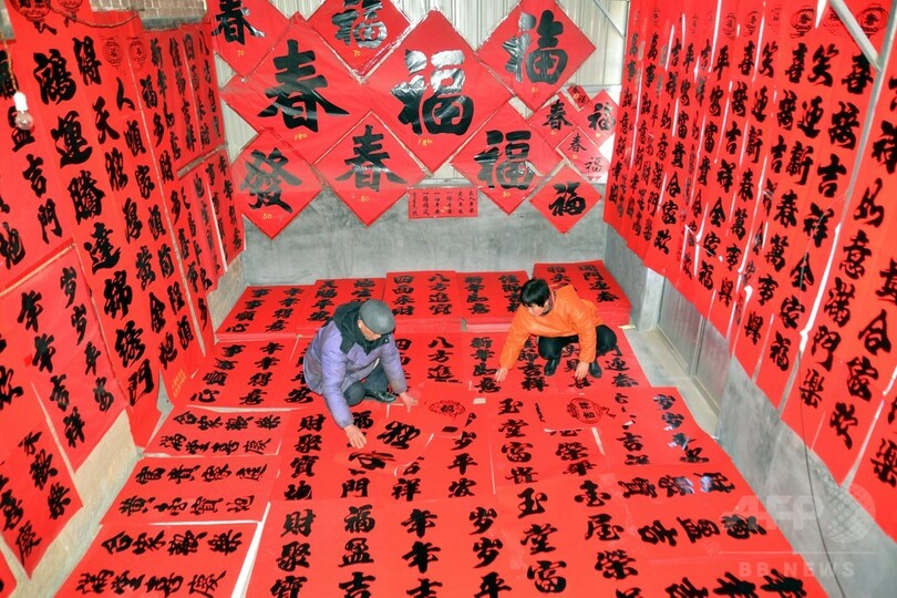 楊さんが作る春聯は、村の周辺で販売されている。楊さんの呼びかけで、村の40世帯以上が「春聯」制作に携わるようになり、1世帯当たり平均で年10万元(約173万円)以上の収入につながっている。「春聯村」として有名になった十里鋪村は、この時期になると村中が真っ赤に染まる。(c)CNS/JCM/AFPBB News