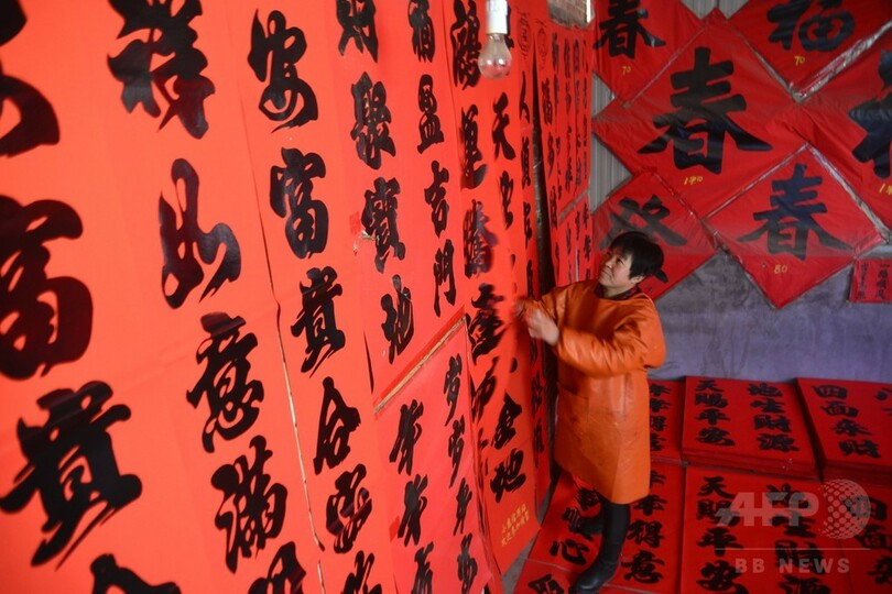 楊さんが作る春聯は、村の周辺で販売されている。楊さんの呼びかけで、村の40世帯以上が「春聯」制作に携わるようになり、1世帯当たり平均で年10万元(約173万円)以上の収入につながっている。「春聯村」として有名になった十里鋪村は、この時期になると村中が真っ赤に染まる。(c)CNS/JCM/AFPBB News