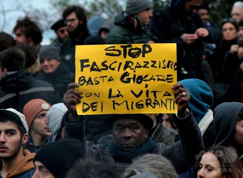 【2月11日 AFP】イタリアで10日、反ファシスト団体や活動家らが主導する抗議デモが中部マチェラータ(Macerata)など複数の都市で行われ、数万人が参加した。