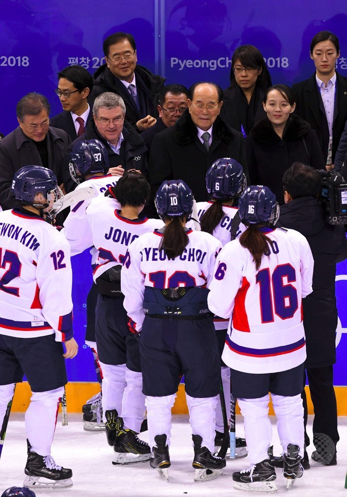 南北合同チームは初戦でスイスに0-8で敗れたが、この試合を観戦したバッハ会長の右隣には文大統領が、左側には北朝鮮の派遣団が座った。バッハ会長は試合後、南北合同チームの選手に声をかけている。(c)AFP