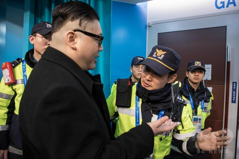 9日に行われた開会式でも、 金委員長のそっくりさんはドナルド・トランプ(Donald Trump)米大統領のそっくりさんとともに会場へ姿をみせ、話題を呼んでいる。2人は平昌オリンピックスタジアム(Pyeongchang Olympic Stadium)の報道関係者席に入り込むと、ちょっとした騒ぎとなり、警備員に取り押さえられていた。(c)AFP