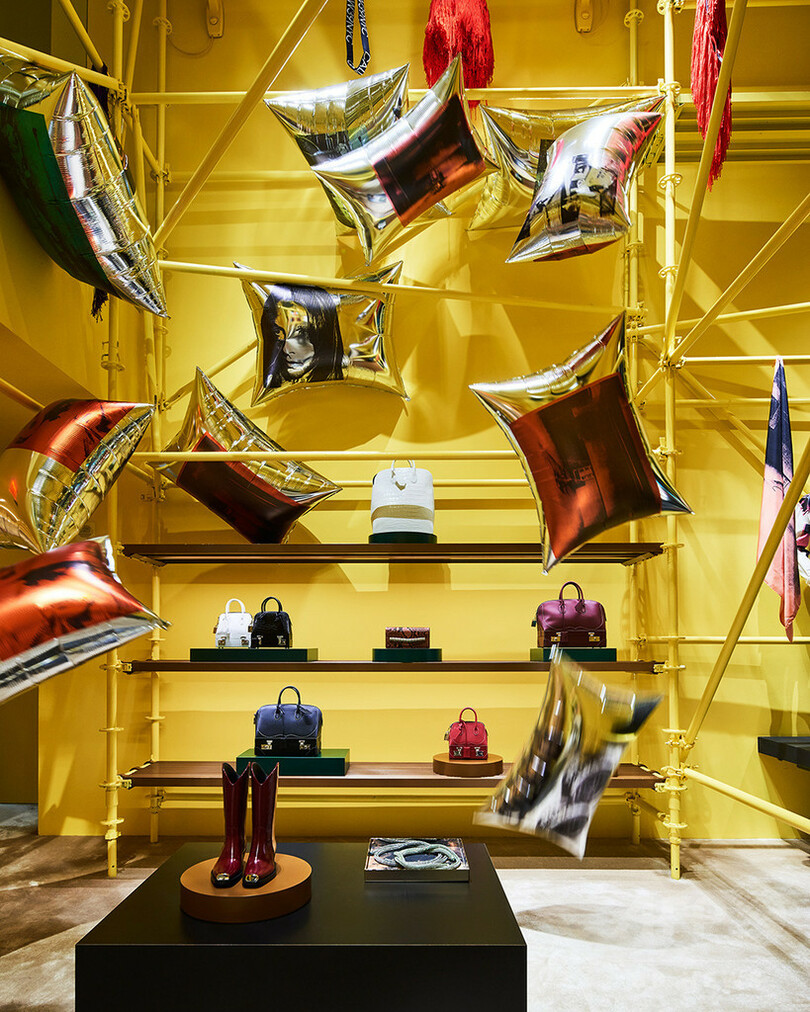 50年以上も前のオリジナル作品と同じ比率で再現される今回のインスタレーションでは、つながれていない数百個のクロムメッキのような「雲」に空気とヘリウムガスを充填する。雲は空中に自由に浮かび、店内を訪れる人々の動きに合わせて漂う。風船には、2018年春のランウェイ・コレクションに登場したウォーホルの「死と惨禍シリーズ」の歪んだ金属の残骸の画像や、ウォーホルと親しかった俳優のデニス・ホッパー(Dennis Hopper)とサンドラ・ブラント(Sandra Bland)のポートレートなどがプリントされている。ゾッとするようなその恐ろしい画像がポップなカンバスにプリントされており、ダイナミックなコントラストを生み出している。