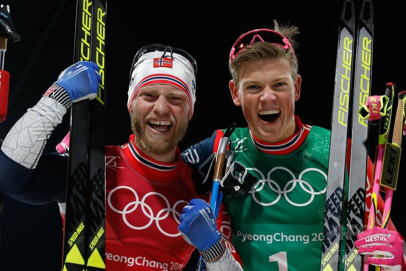男子チームスプリントは、ノルウェーのマルティン・ヨンスル・スンビ(Martin Johnsrud Sundby)/ハンネス・ヘスフロト・クレボ(Johannes Hoesflot Klaebo)組が、2位に入ったOAR(ロシアからの五輪選手)ペアに1秒71差をつけて金メダルに輝いた。3位にはフランスが入った。(c)AFP