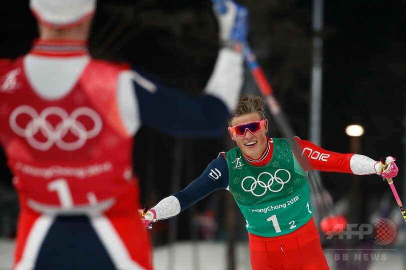 男子チームスプリントは、ノルウェーのマルティン・ヨンスル・スンビ(Martin Johnsrud Sundby)/ハンネス・ヘスフロト・クレボ(Johannes Hoesflot Klaebo)組が、2位に入ったOAR(ロシアからの五輪選手)ペアに1秒71差をつけて金メダルに輝いた。3位にはフランスが入った。(c)AFP