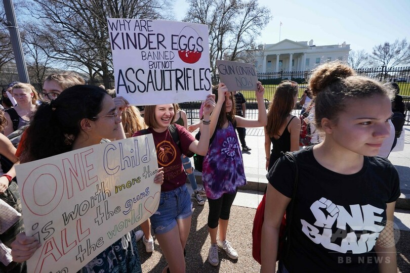 フロリダ州を含む全米各地の高校では、被害者らとの連帯を示すために生徒らが授業を放棄し集会を開き、この悲劇を転機に銃規制論議の行き詰まりを解消することを誓った。首都ワシントンでは、地元の高校生数百人がホワイトハウス(White House)前に集まり、銃ロビー団体「全米ライフル協会(NRA)」を批判する声を上げ、ドナルド・トランプ(Donald Trump)大統領に行動を起こすよう要求した。(c)AFP/Gilles CLARENNE