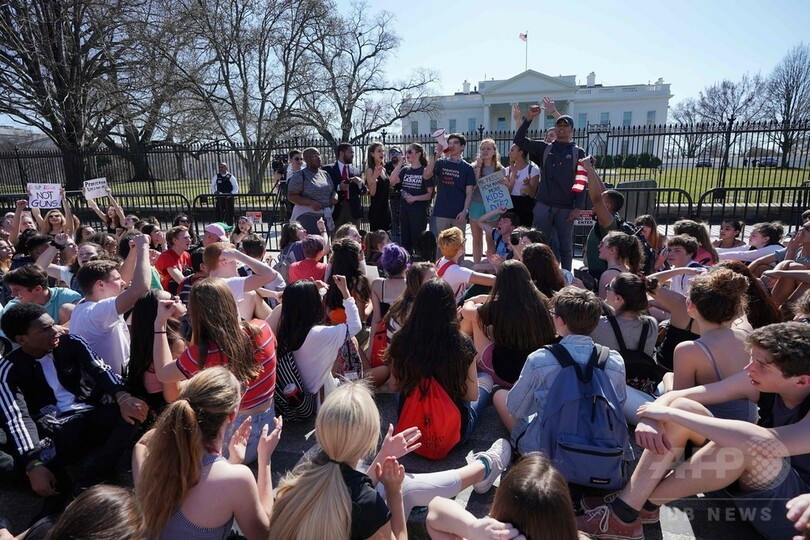 フロリダ州を含む全米各地の高校では、被害者らとの連帯を示すために生徒らが授業を放棄し集会を開き、この悲劇を転機に銃規制論議の行き詰まりを解消することを誓った。首都ワシントンでは、地元の高校生数百人がホワイトハウス(White House)前に集まり、銃ロビー団体「全米ライフル協会(NRA)」を批判する声を上げ、ドナルド・トランプ(Donald Trump)大統領に行動を起こすよう要求した。(c)AFP/Gilles CLARENNE