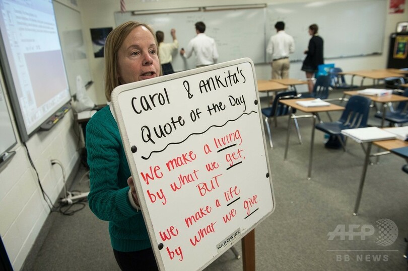 同校の数学教師、リンダ・ブラッグ(Linda Bragg)さんが「今週の標語」を書いて教室の出入り口に置いている防弾ホワイトボードは、いざというときには生徒の命を守る盾になる。