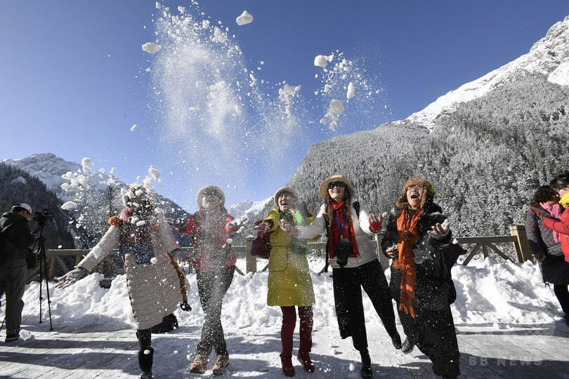 観光客に開放されたのは、「長海(Changhai)」「五彩池(Wucaichi)」「鏡海(Jinghai)」「諾日朗(Nuorilang)の滝」「樹正群海(Shuzhengqunhai)」「双龍海(Shuanglonghai)の滝」「扎如寺(Zharu Temple)」などで、原則的に徒歩での観光。(c)CNS/JCM/AFPBB News