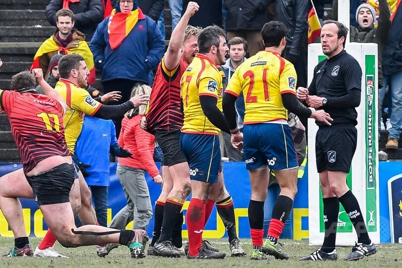 【3月19日 AFP】2019年ラグビーW杯日本大会(Rugby World Cup 2019)欧州予選が18日、ブリュッセルで行われ、スペインは10-18でベルギーに敗れ、本大会自動出場を逃した。スペインの敗戦は、すでに全日程を終えていたルーマニアのW杯本選出場確定を意味しており、スペインの選手たちは試合終了後、ベルギー戦を担当したルーマニア人の審判をピッチで取り囲むなどして怒りをあらわにした。