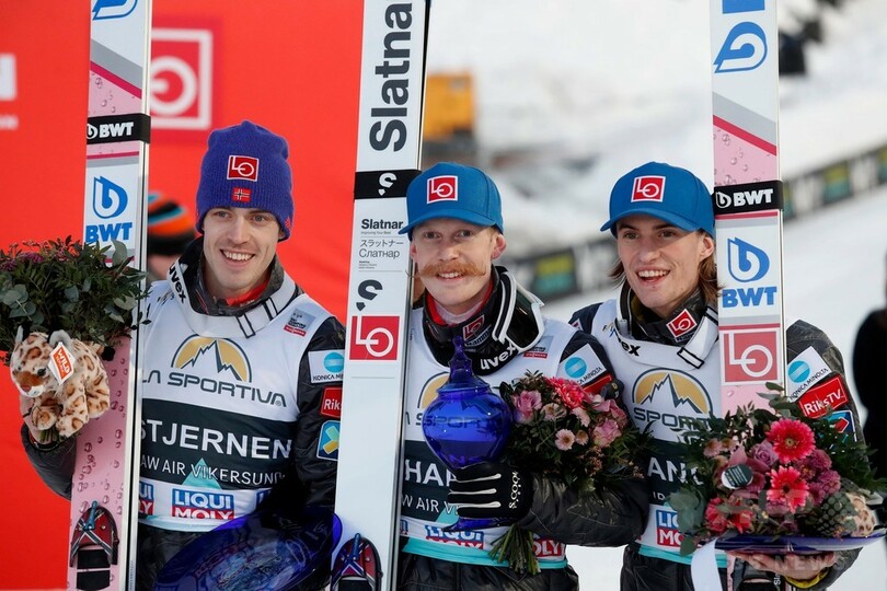 2位にアンドレアス・スティエルネン(Andreas Stjernen)、3位にはダニエル・アンドレ・タンデ(Daniel-Andre Tande)が入り、地元ノルウェー勢が表彰台を独占している。(c)AFP