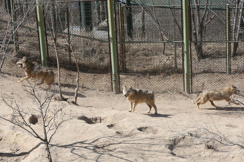 昼下がりのチベット高原野生動物園では、オオカミやクマ、ロバなどの「住民」ははしゃいだり、うとうとしたり。春の日差しを満喫していた。(c)CNS/JCM/AFPBB News