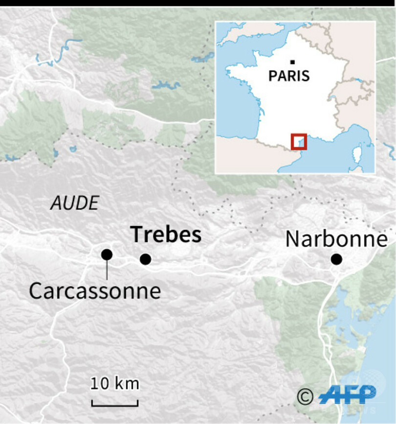 この事件発生の15分前には、トレブに近いカルカソンヌ(Carcassonne)でも発砲があり、ジョギングに出ていた警察官らのうち1人が撃たれて負傷した。エドゥアール・フィリップ(Edouard Philippe)首相によると、同警察官の容体は安定しているという。