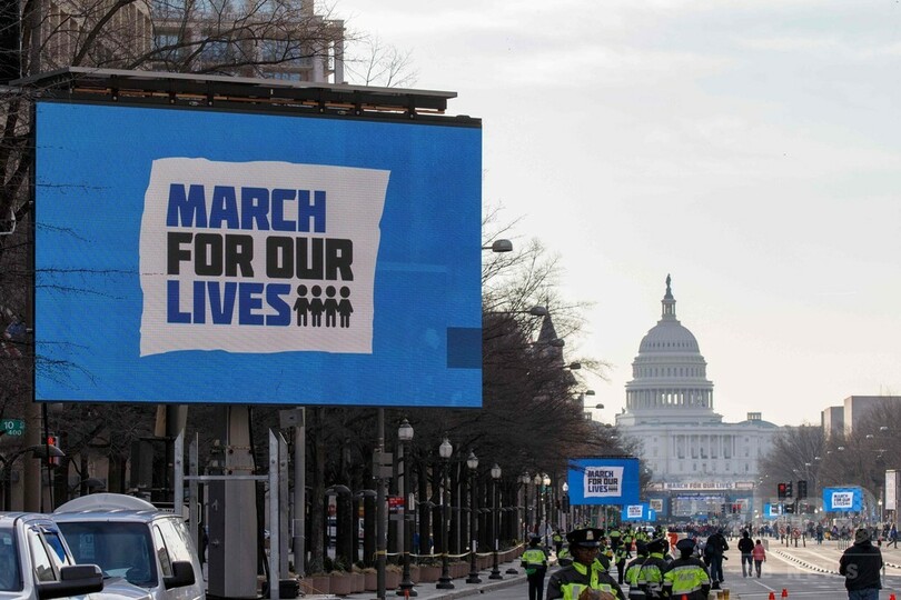 付近のエリアは参加者約50万人を収容するため通行止めとなり、通りの脇に設置された巨大スクリーンに「March for Our Lives」という文字が映し出された。